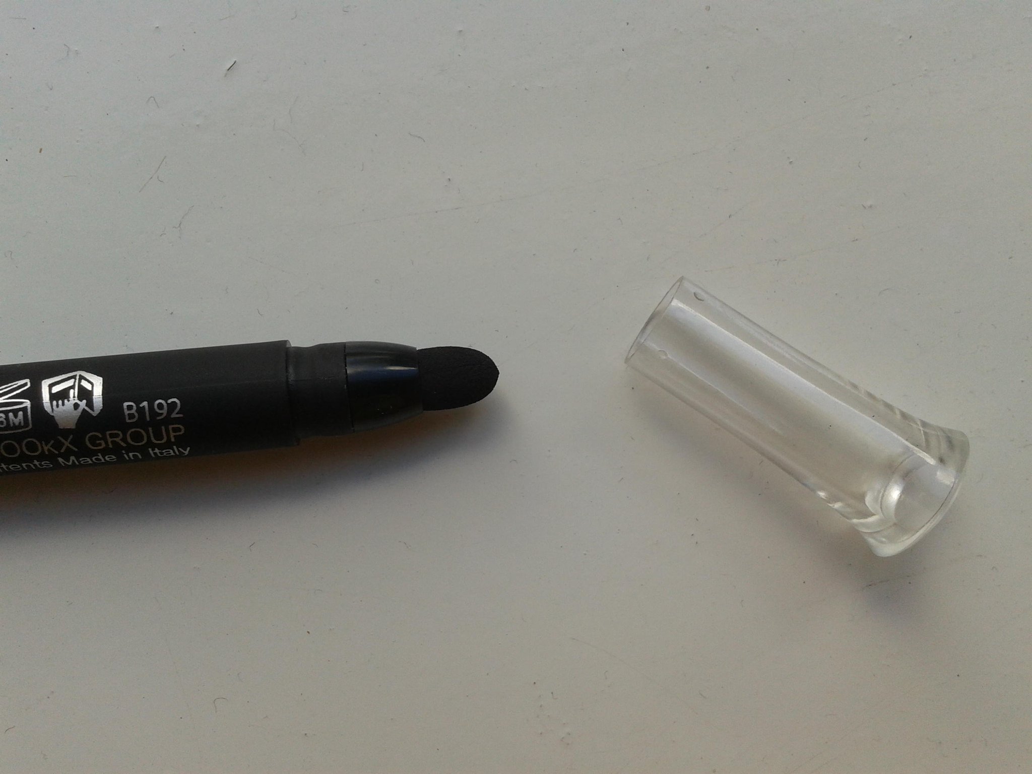 Zoals je op de foto hierboven kunt zien, kan je zowel dikke als dunne strepen zetten en kan je zien hoe goed hij is gepigmenteerd. Nadat ik deze foto had gemaakt wilde ik hem weg halen met een reinigingsdoekje maar dat ging niet zo gemakkelijk. Ik moest flink boenen wat dus wilt zeggen dat hij heel goed blijft zitten.